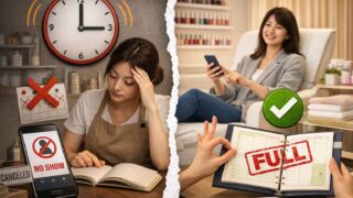 コラム無断キャンセル・当日キャンセルを減らす方法 振り回されない仕組みの作り方 ともえです! 「予約が入った!」と思ったら、当日の朝に「やっぱりやめます」ひどいときは、予約時間の直前に電話が来て「今日キャンセルで…」 個人サロンほど、この一件が痛いですよね。その... 2026.02.06コラム
